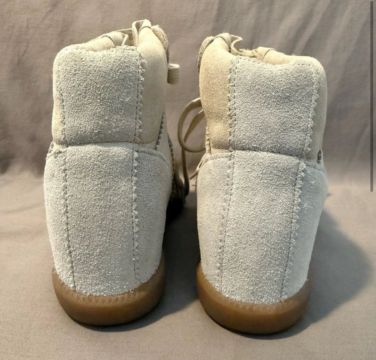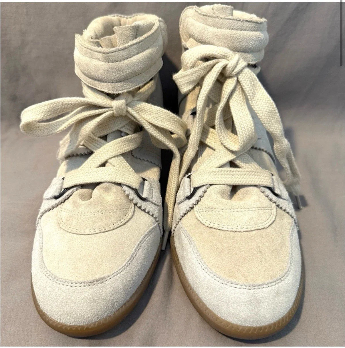 Isabel Marant Over Basket Bluebel high top sneakers in Chalk. Suede construction with a leg flattering hidden wedge. Available in EU sizes 37 to 41 (US 6.5–10.5 / UK 4.5–8.5) . They are in mint, unworn condition with 2 original dust bags. The original retail price was $695.
